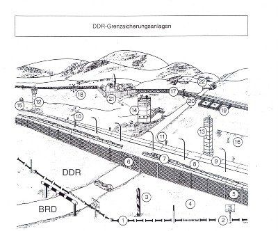 1. Die DDR Grenzanlagen, insbesondere der Metallgitterzaun, bilden nicht die Grenze zur DDR! Die Anlagen stehen vielmehr in unterschiedlicher Entfernung jenseits der Grenze auf dem Gebiet der DDR.